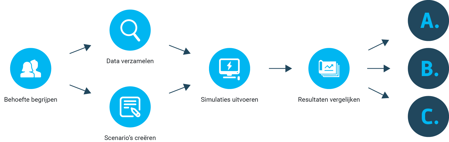 Wanneer uit de simulatie specifieke oplossingen naar voren komen staat Batenburg klaar om deze te implementeren. Met simulaties krijgen we inzicht in verschillende configuraties waarbij rekening wordt gehouden met de volgende oplossingen of scenario's: